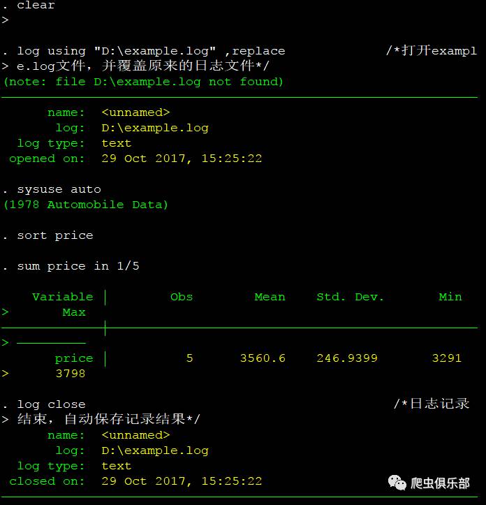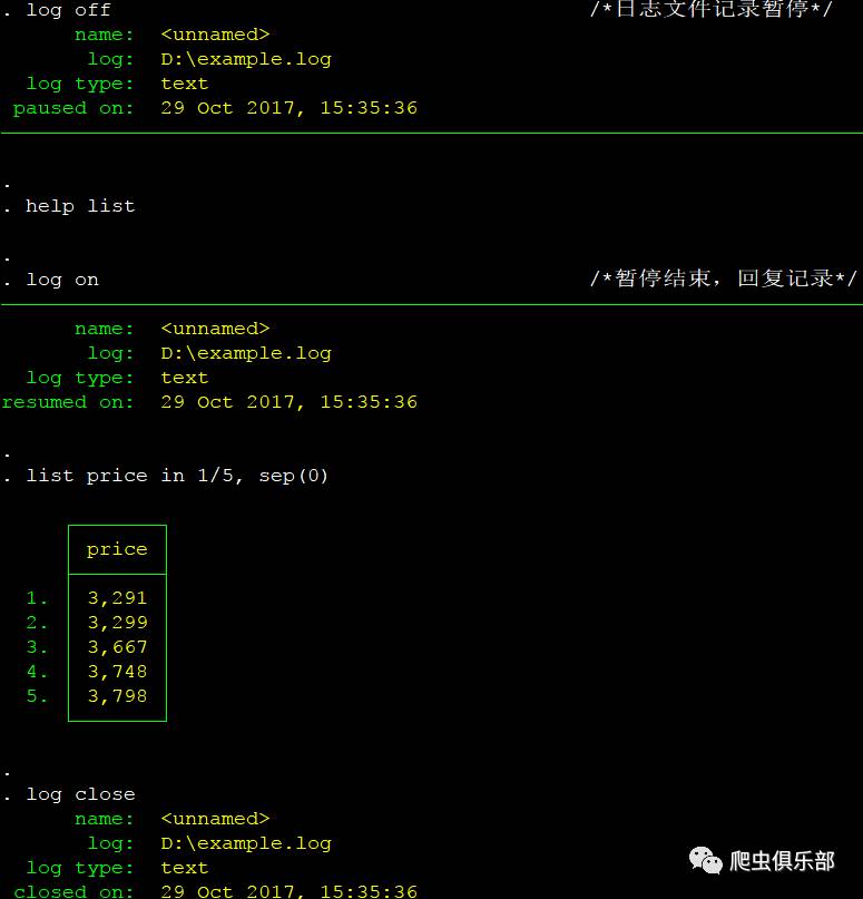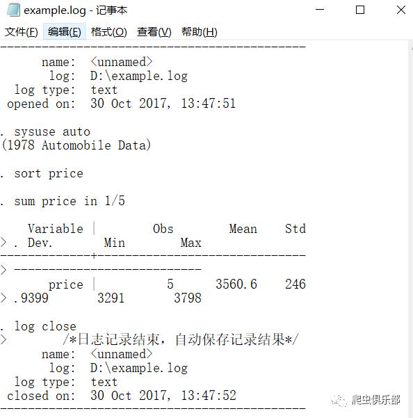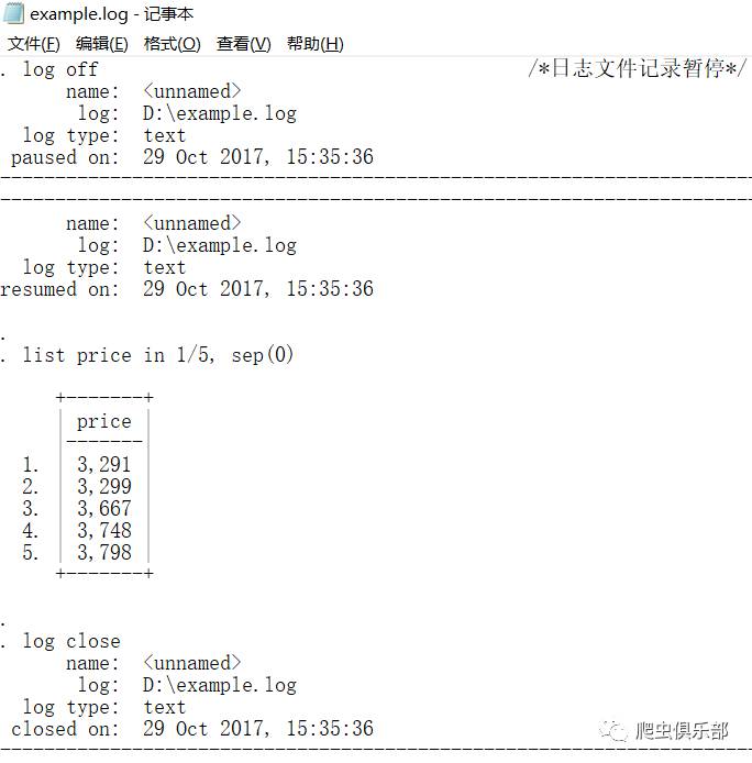 这时我们就将从log using "D:\example.log" ,replace开始,除了log off和log on之间的help list命令以外的所有命令以及结果记录并保存在了"D:\example.log"文件里面。