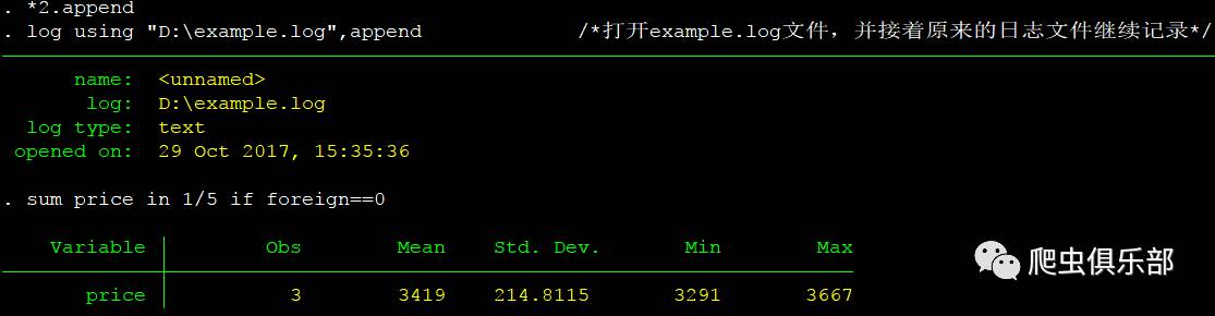 第二个记录方式是log using "D:\example.log",append 表示的是打开example.log文件,并接着原来的日志文件继续记录。