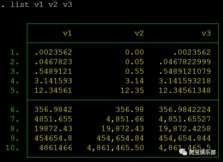 生成数据的默认格式是%9.0g,通过对比我们可以清楚地看出,在%#w.#df格式中,#w表示字节长度,#d表示保留几位小数,这里需要注意以下几点: