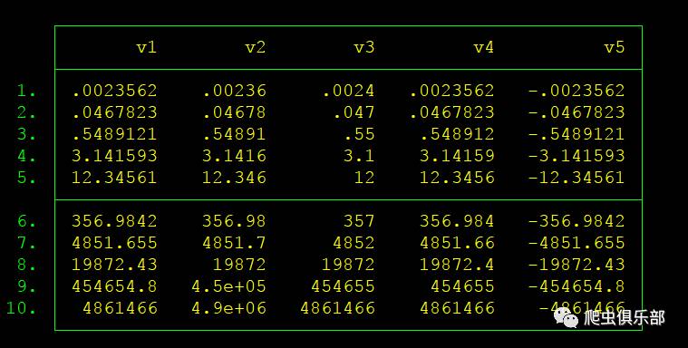 在这里,对于%#w.#dg格式。#w代表字节长度为#w,#d表示保留#d个有效数字。如果#d等于0,则显示最大字节长度为#w的格式。如果#d不等于0,则显示#d个有效数字。#d针对的是小数,所以#d小于整数的位数时,整数部分都会显示出来。这里值得注意的是,在%#w.#dg格式中,会给符号留一个字节位置,所以对于%9.0g 格式的v1只显示七个数字和一个小数点。而对相同格式的v5,显示了七个数字,一个小数点和一个负号,正好等于九个字节长度。