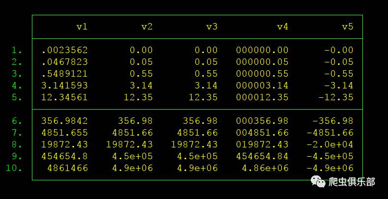 第二,从上图我们可以发现v3的第9,10行都是%#w.#de格式,这是因为,如果数值的长度超过设置的#w,则会显示科学记数法格式。