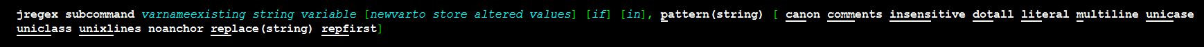 jregex是一个基于java的插件,用于Stata中的正则表达式。jregex命令可以实现stata与java的交互,通过stata调用java中的正则表达式,jregex的语法结构如下: