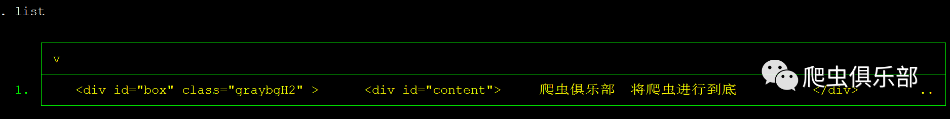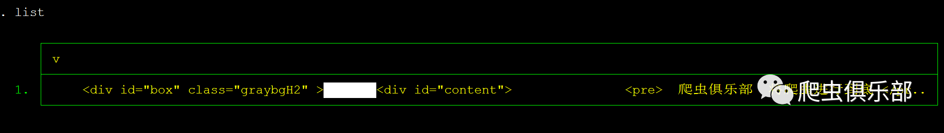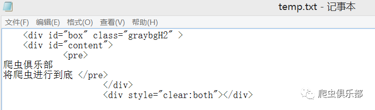 在推文用正则表达式揭开回车键的面纱中, 我们讲到上图阴影部分(即文本不同行之间)是存在换行符和回车符的,现在假设要从变量v中提取“爬虫俱乐部”以及“将爬虫进行到底”这两个字符串,通过分 析网页源代码可知,在提取内容的起始位置有一个唯一的字符串“<pre>”,末尾位置有唯一的字符串“</pre>”,那么我们 把字符串“<pre>” 及之前多余的字符串和“</pre>”及之后多余的字符串删掉即可,我们首先用元字符“.”进行匹配: