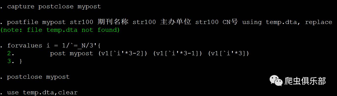 postfile mypost str100 期刊名称 str100 主办单位 str100 CN号 using temp.dta, replace