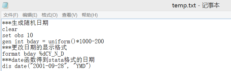 file write `temp' `"***date函数得到stata格式的日期"' _n