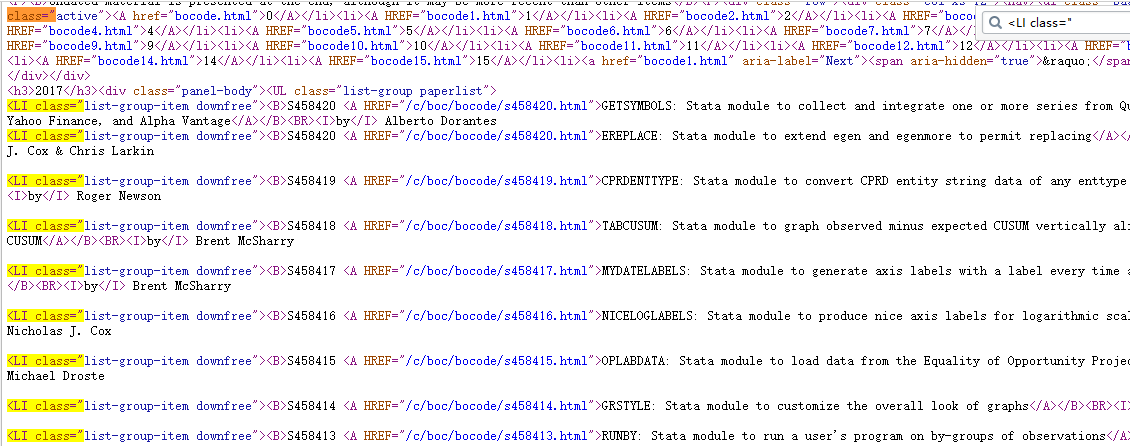 下面我们以抓取波士顿大学经济学院一个stata学习网站上为例,介绍subinfile命令在处理源代码时,如何实现它的强大之处。在这个网页(https://ideas.repec.org/s/boc/bocode.html)中,我们想要提取每篇文章的编号、文章题目和作者,打开网页源代码: