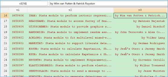 发现网页中除了我们想要的编号、文章题目和作者之外,还有其他的不重要的信息,一般情况下,我们会将源代码导入Stata,然后用正则表达式或字符串函数进行处理,最终得到目标信息,并整合成我们需要的格式。而subinfile 命令只需要一行命令,就能把网页源代码处理成为我们最终想要的结果,它是如何做到的呢?具体来看,输入命令: