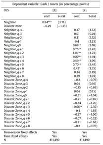 从回归结果中,可以发现,从飓风发生的q0季度开始,受灾区附近公司显著增加现金持有。这个效应一致持续到q+3季度、q+4季度(飓风发生后的第三季度和第四季度),之后效应逐渐减弱,直到q+8季度(飓风经过后的两年)公司现金持有量减至飓风发生前的水平。