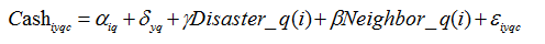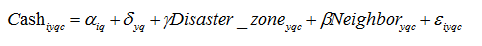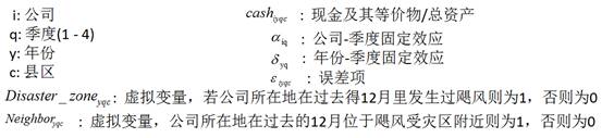 当 飓风经过,美国公司都会被分为三组:受灾区公司、受灾区附近的公司、剩余的公司。作者将受灾区附近的公司(Neighborhood)作为实验组,对他们 来说,飓风风险很显著;将离受灾区较远的公司(the rest of US)作为对照组,对他们来说,飓风事件不明显。作者使用双重差分法,通过衡量飓风发生后实验组公司现金持有量相对于对照组公司的变化,来反应风险突显程 度对管理者风险感知的影响。实验组排除了受灾区公司,是因为飓风直接影响到受灾区公司的流动性,其现金持有量无法反映管理者的心理变化。但本文并没有在总 的样本中剔除受灾区公司,而是将受灾区公司作为控制变量,排除其现金波动的影响。