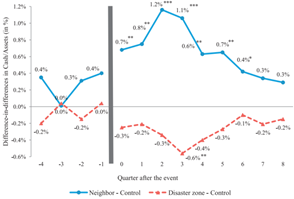 根据回归结果绘图,可以更直观的看到受灾区、受灾区附近的公司在飓风发生前后相对于对照组公司现金持有量的变化: