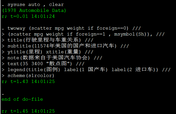 由上图我们可以看到,第一条读入auto数据的命令花了约0.01秒,而画图这条长长的命令花了约1.43秒,运行这段完整的程序一共花了1.45秒。看到这里,童鞋们是不是也蠢蠢欲动,想要测试一下自己的电脑运行这段程序到底需要几秒呢?