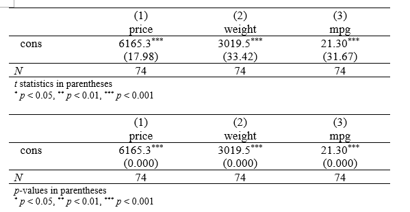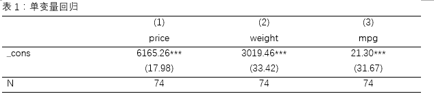 reg2docx a1 a2 a3 using E:/单变量t检验.docx, replace b(%9.2f) t(%7.2f) title(表1:单变量回归) mtitles("price" "weight" "mpg")