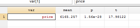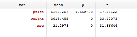 上述程序中的"price"是一个字符串,r(mu_1)、r(p)、r(t)分别是单变量t检验的均值、p、t值的返回值。最后的结果如下: