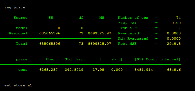 对price做单变量回归,结果中的截距项6165.257即price的均值,t值为17.98,p值为0.000。