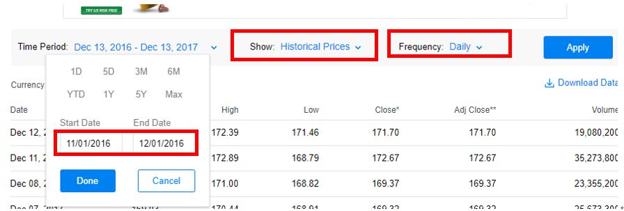 首先以AAPL公司2016/11/01到2016/12/01一个月的数据为例。我们在下边的编辑框中选择时间,并选择Historical Price以及日交易数据Daily,最后点击Apply。