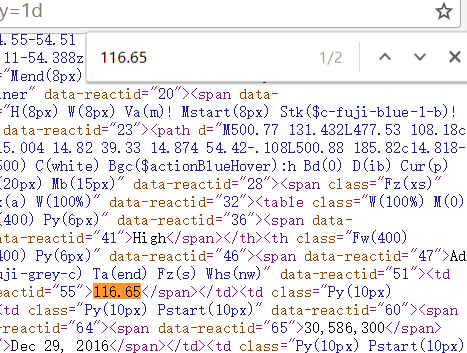 可以看到在选取相应的日期之后呢,链接也发生了相应的变化。接着我们看一下网页源代码(下面在源代码中检索2016-12-30的开盘价116.65):