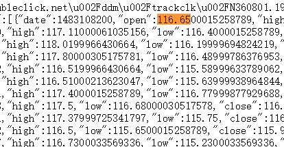 我 们发现2016年12月30日的开盘价116.65检索结果有两条,并且发现第一处的数字与网页上的数字116.65是一样的,而第二处是一长串的数字 116.6500015258789,事实上第一处是第二处的四舍五入;并且我们发现,第二处的日期也是时间戳的格式,例如 116.6500015258789前边的1483108200。接着我们又检索了2016-01-04的开盘价102.61,发现只有一处: