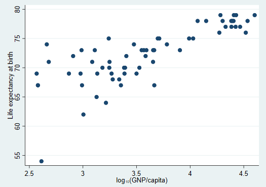 scatter lexp loggnp,xtitle(log{sub:10}(GNP/capita))