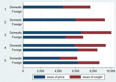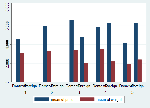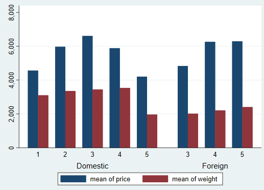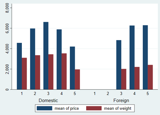 值得注意的是,在这条程序中,我们使用了两个over()选项,它表示首先按照foreign进行分组,然后再根据rep78分组(两个over()的先后顺序不同,会得到不同的条形图),得到: