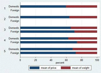 graph hbar price weight , over(foreign) over(rep78) stack percentage