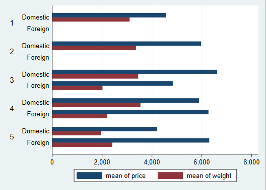 由上面这张条形图我们可以发现,虽然在Domestic这组中,rep78的取值有1,2,3,4,5,但是在Foreign这组中,rep78的取值只有3,4,5,就出现了上述的图形,这主要是因为Foreign有缺失值,从而使图形变得不美观,这时可以使用nofill来解决这个问题:
